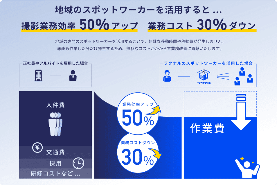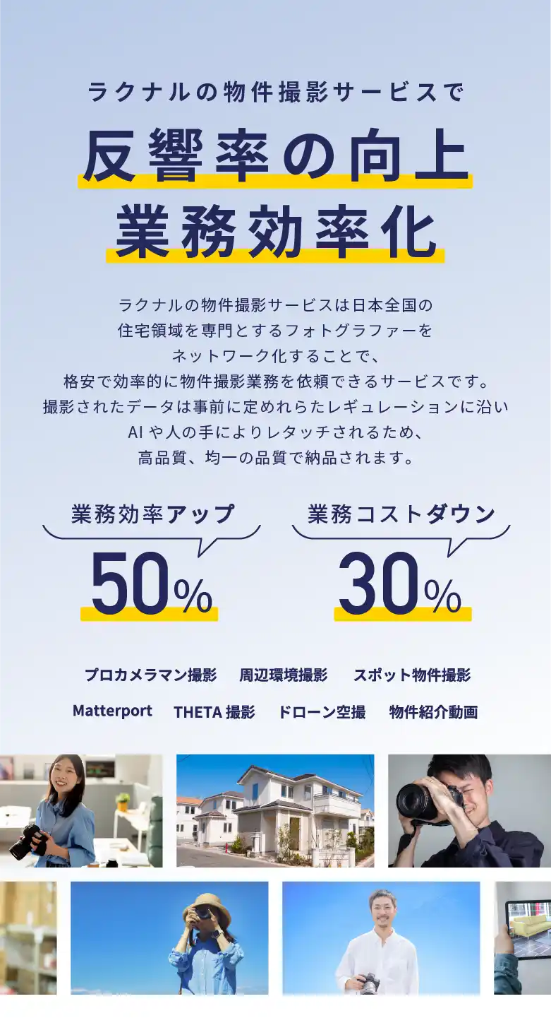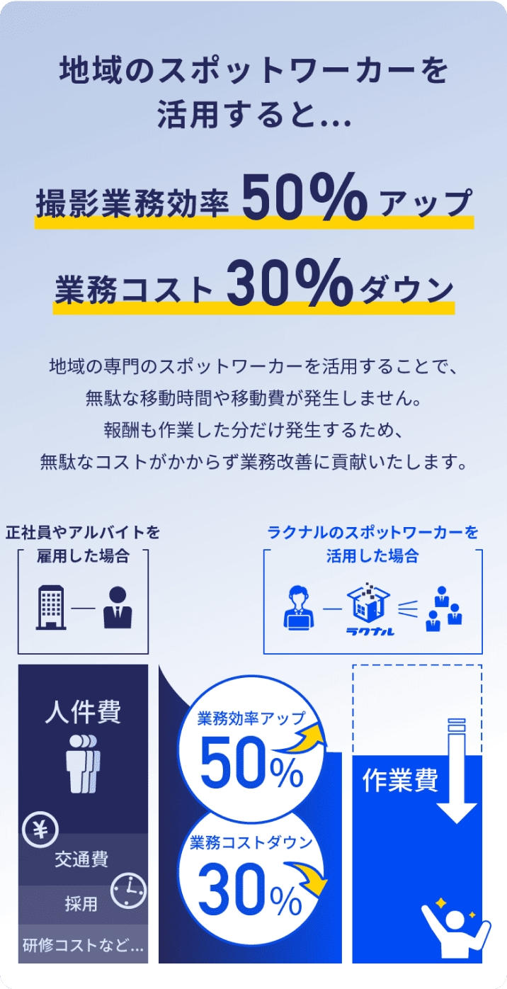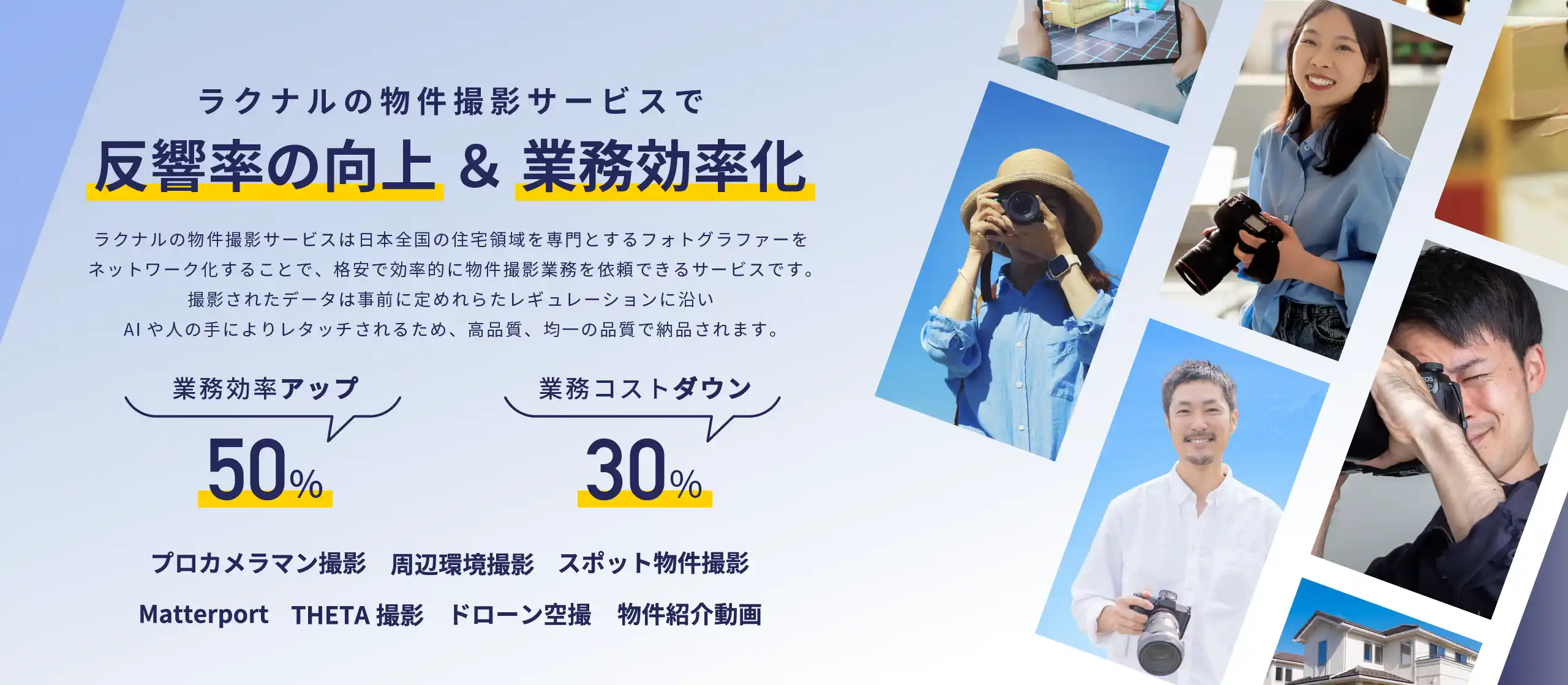 ラクナルでは不動産事業者様と日本全国の不動産の物件撮影を得意とするフォトグラファーをスキルマッチングするため、交通費はいただいておりません。 案件ごとで都度見積もり依頼をする必要がなく、ご利用したい時にすぐご発注いただくことが可能です。