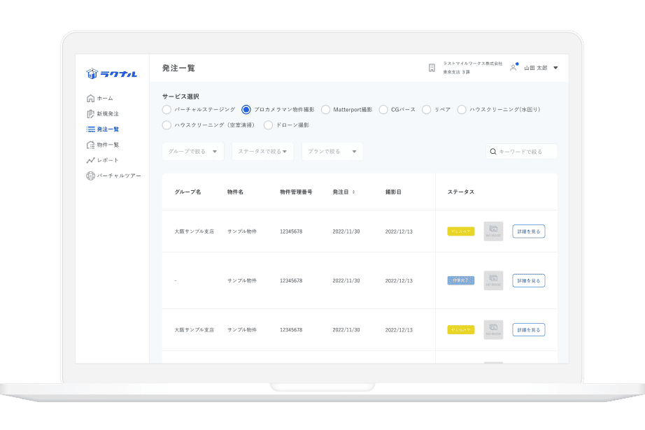 撮影の日程調整や納品データのやり取り、請求処理など物件撮影に関わる様々な煩雑な業務をラクナルのクラウドシステムを利用することでスマートに解決いたします。発注データは物件ごとにすべて管理され、いつ、どの店舗で何件発注があったかを正確に把握することができます。