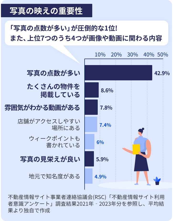 不動産情報サイト事業者連絡協議会(RSC)が毎年実施している、不動産情報サイト利用者意識アンケートによると、問い合わせや訪問を行う際に不動産会社を選ぶ時のポイントの第一位が「物件写真の点数が多いこと」でした。 また、物件写真の見栄えを変えるだけで4倍も反響があがり、写真が11枚以上ある物件は10枚以下の物件より約1.4倍反響率が高いという検証結果も出ています(CHINTAI掲載物件の反響実績より)。 「写真が多い!」「写真がキレイ!」といった印象はエンドユーザーにとって不動産会社の立地や知名度よりも重要であり、不動産事業者様が「一番簡単」に実施できる改善対策です。